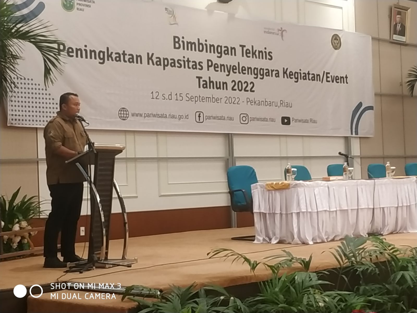 Pelaksanaan Bimtek Peningkatan Kapasitas Penyelenggaraan Kegiatan /Ivent Tahun 2022 di laksanakan di Hotel Mutiara Merdeka dari Tanggal 12 S/d 15 September 2022. Peserta berjumlah 50 orang terdiri dari ASN Pariwisata Provinsi Riau dan ASN Pariwisata dari Kabupaten Kota Se Riau. Menghadirkan tiga Nara Sumber IBU Dr. Fmmy Indriany Dalimunthe, SE, M.SI, CHE, CEE DPD ASPERAPI Sumatera Utara, Dr. Muhammad Halfi Syahputra, SE, M.SI DPD ASPERAPI Medan dan Dody Rasyid Amin selaku Founder Subayang. **No/ Inf