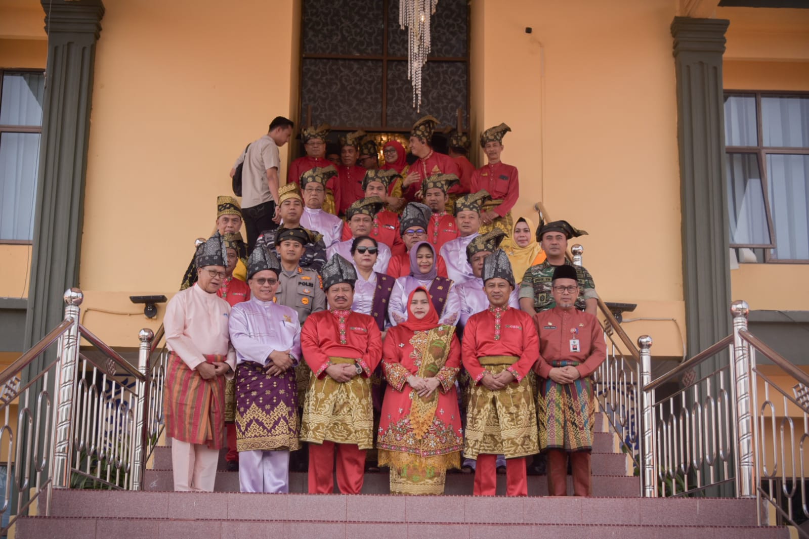 Bupati Kasmarni dan Wakil Bupati Bengkalis Dr. H. Bagus Santoso mengenakan baju kurung melayu berwana merah serta dihiasi kain songket bercorak kuning, sempena menggikuti rapat Paripurna Hari Jadi Bengkalis ke-511, Minggu 30 Juli 2023 pagi, di gedung Rapat Paripurna DPRD Bengkalis.