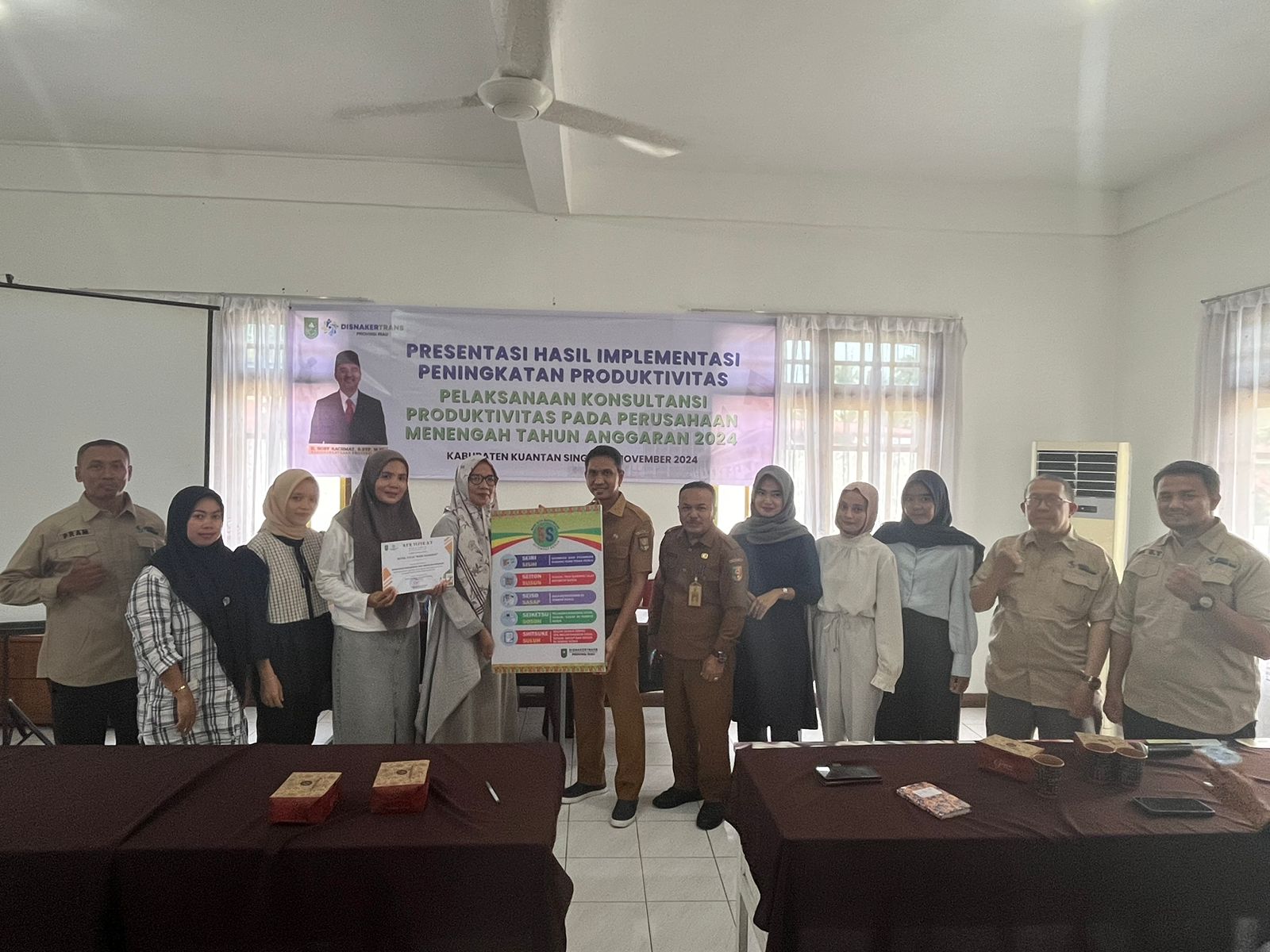 Kegiatan Konsultansi Produktivitas pada Perusahaan Menengah ini sudah dilaksanakan beberapa waktu yang lalu di 5 perusahaan di wilayah Kabupaten Kuantan Singingi dengan metode 4 kali kunjungan dan bimbingan langsung ke perusahaan yang terdiri dari identifikasi masalah, perumusan masalah utama, penyusunan rencana aksi/ rekomendasi peningkatan produktivitas dan implementasi peningkatan produktivitas dan setelah itu di akhir program setiap perusahaan diwajibkan mempresentasikan hasil implementasi peningkatan produktivitas di perusahaannya tersebut di hadapan Instansi terkait dan beberapa perusahaan yang bertujuan agar seluruh Instansi dan perusahaan turut serta membudayakan 5S di tempat kerjanya masing-masing.