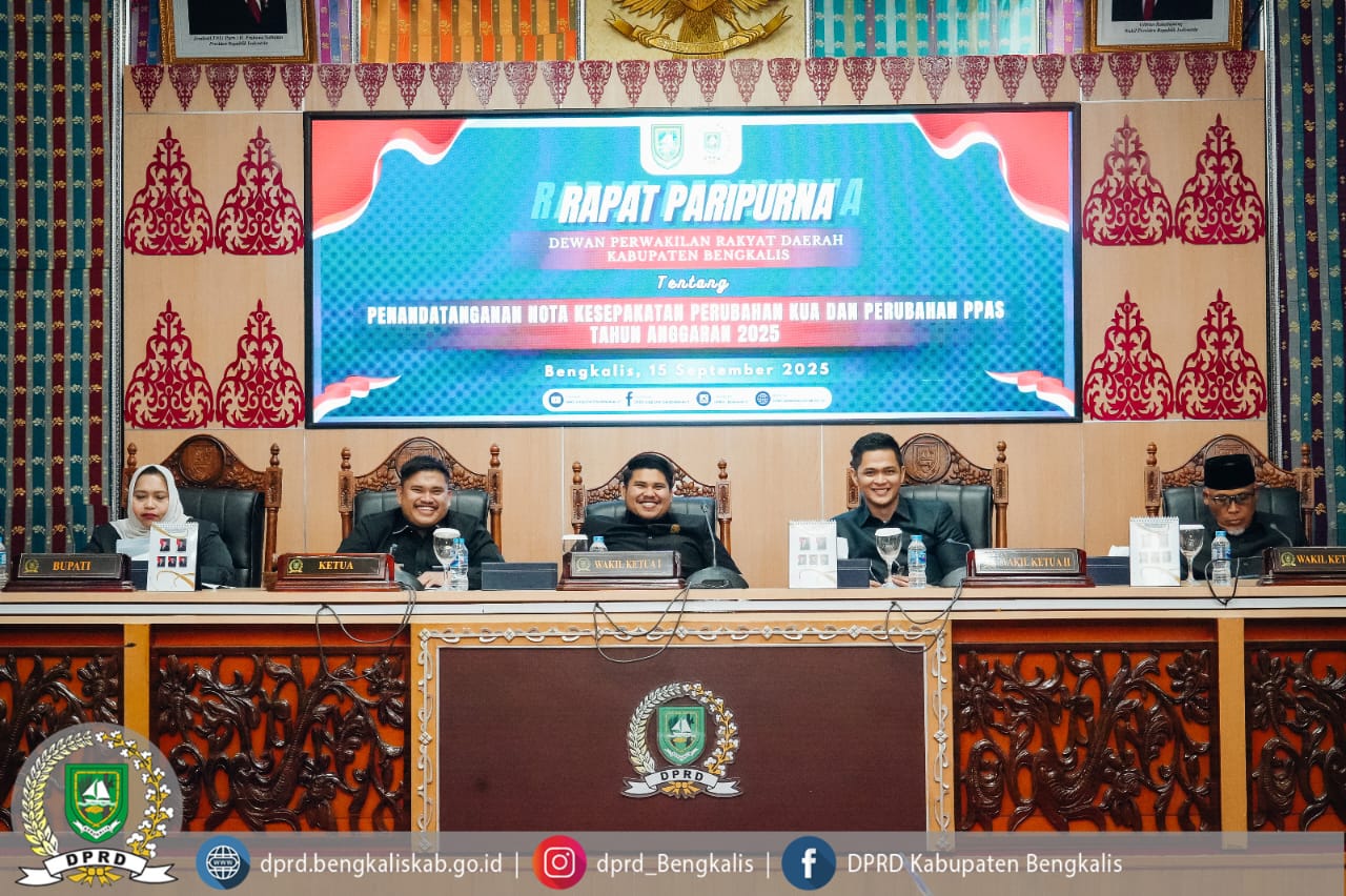 BENGKALIS - DPRD Kabupaten Bengkalis menggelar Rapat Paripurna ke-6 Masa Persidangan I Tahun Sidang 2025 dengan agenda utama Penandatanganan Nota Kesepakatan Perubahan Kebijakan Umum Anggaran (KUA) dan Prioritas Plafon Anggaran Sementara (PPAS) Tahun Anggaran 2025, Senin (15/09/25).