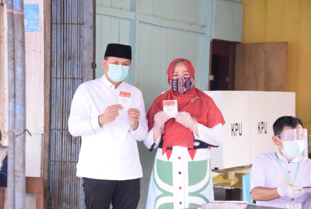 Ke foto : Calon Wakil Bupati nomor urut 2 H. Indra Gunawan mencoblos di TPS 28 Kelurahan Ujungbatu.