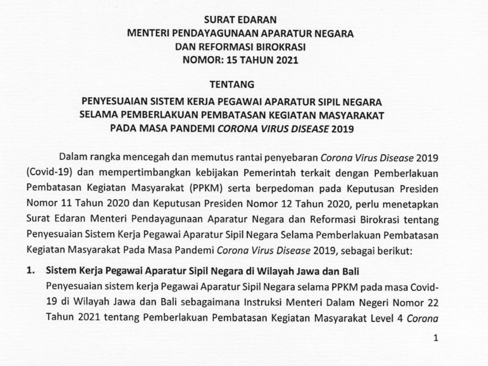 SE MenPAN RB Nomor: 15 Tahun 2021 itu diterbitkan Tjahjo Kumulo pada Rabu (21/7/2021), dalam rangka mencegah dan memutus rantai penyebaran Corona Virus Disease 2019 (COVID-19), dan mempertimbangkan kebijakan Pemerintah terkait dengan Pemberlakuan Pembatasan Kegiatan Masyarakat (PPKM). Berpedoman pada Keputusan Presiden Nomor 11 Tahun 2020 dan Keputusan Presiden Nomor 12 Tahun 2020.