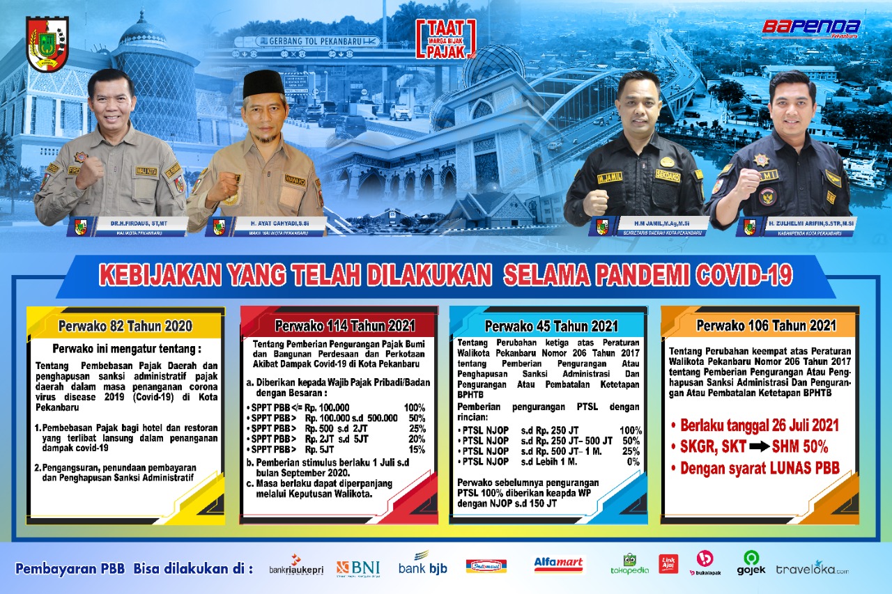 Badan Pendapatan Daerah (Bapenda) Kota Pekanbaru telah mengeluarkan sejumlah kebijakan yang memudahkan serta meringankan wajib pajak (WP) selama masa pandemi Covid-19. Keringanan bagi wajib pajak itu diatur dalam Peraturan Walikota (Perwako) sejak tahun 2020 hingga tahun 2021.