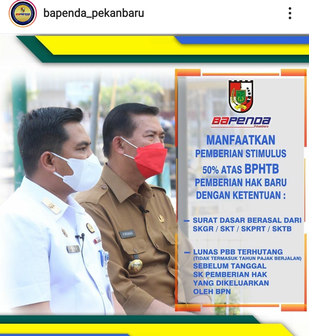Disamping itu juga, Badan Pendapatan Daerah (Bapenda) Kota Pekanbaru masih memberikan stimulus untuk pembayaran pajak bumi bangunan (PBB), hingga akhir Juni Kemarin 2021. Stimulus pajak juga diberikan kepada pensiunan aparatur sipil negara (ASN).