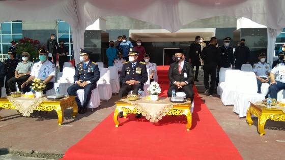 Ket Foto : Walikota Pekanbaru Dr. H. Firdaus, MT di Dampingi Sekdako HM. Jamil, M.Ag, M.Si , Kadishub Kota Pekanbaru, H. Yuliarso, S.TTP, M.Si Melaksanakan Upacara Hari Perhubungan Nasional Tahun2021 Sekaligus Lounching Bus Feeder TMP di Koridor 9. di Perkantoran Tenayan Raya, Jumat (17/09/2021).t