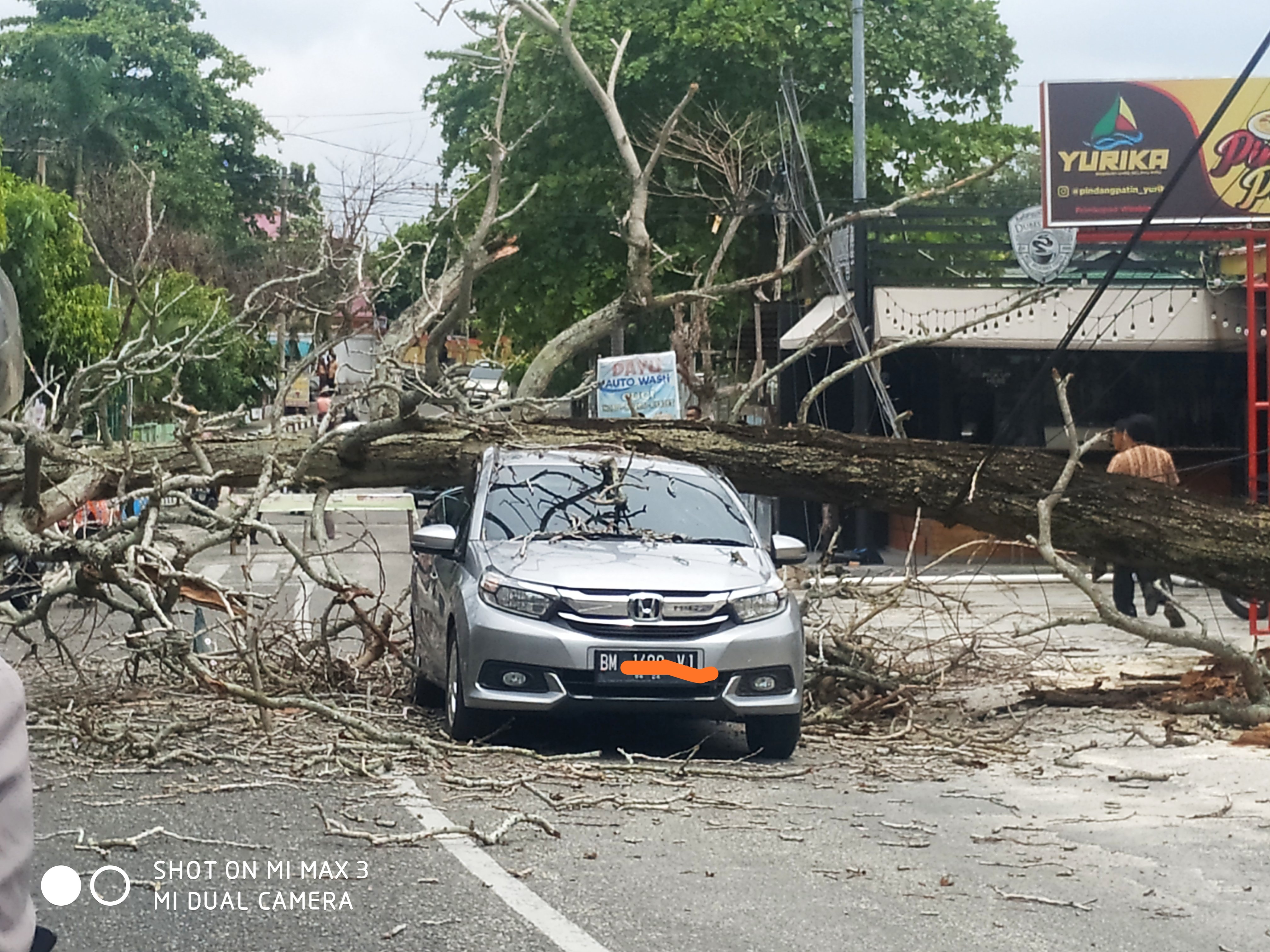 UTUSANRIAU.CO, PEKANBARU - Mobil ringsek ketimpa pohon tumbang. Kejadian tersebut terlihat di depan RM Yurike berada di jalan Sutomo tidak jauh dari panti asuhan sri mujinab. Kejadian tersebut membuat pengendara harus mutar balik karena badan jalan yang tertimpa pohon kayu besar tumbang hingga mobil sedan yang melintas ringsek.