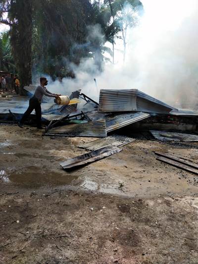 UTUSANRIAU.CO, ROKAN HULU-Rumah Nasril (45 thn) warga Susan 2 Kasang salak ET 14 RW 05 Desa Bonai darussalam Kecamatan Bonai Darussalam Rohul rata dengan tanah akibat sepak terjang sijago merah, Senin (6/12/2021)
