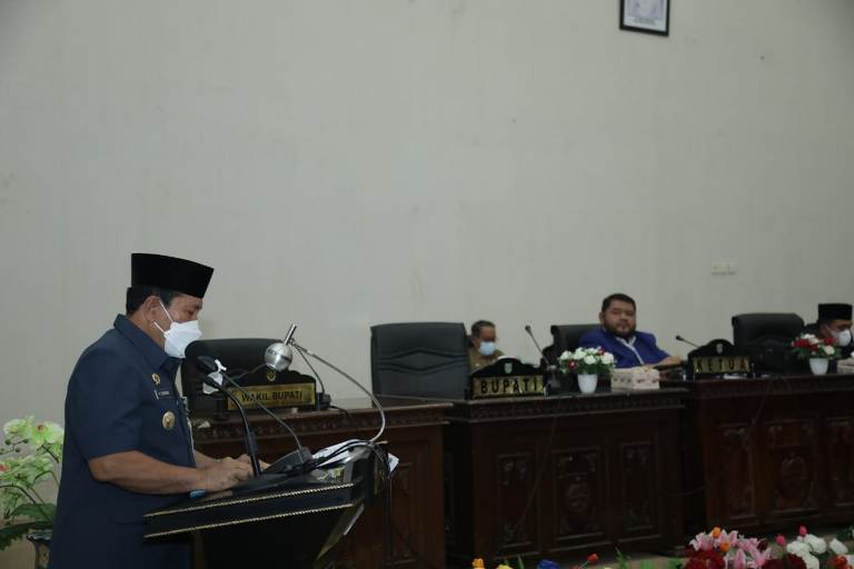 Ket Foto : Bupati Sukiman saat menbacakan LKPJ Bupati Tahun 2021 dalam Sidang Paripurna