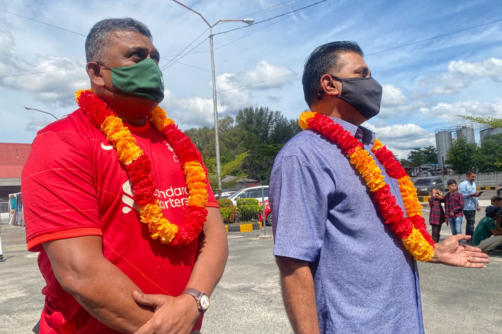Ket foto : Dua orang wisatawan mancanegara dari Melaka disambut kalung bunga hias di Pelabuhan Internasional Dumai, Jumat (6/5/2022). (foto dok Dispar Riau)