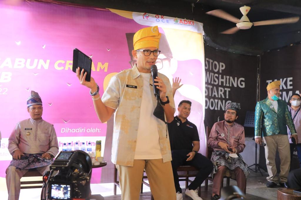 UTUSANRIAU.CO, PEKANBARU - Menteri Pariwisata dan Ekonomi Kreatif (Menparekraf) Sandiaga Salahuddin Uno didampingi Penjabat (Pj) Wali Kota Pekanbaru Muflihun dan Kadis Pariwisata Riau Roni Rahmat menghadiri Pelatihan Sabun Cream dan Hand Rub di Karambia Cafe, Sabtu (20/8). Pelatihan ini diikuti ratusan emak-emak dan pelaku ekonomi kreatif dari berbagai kabupaten/kota lainnya di Riau.
