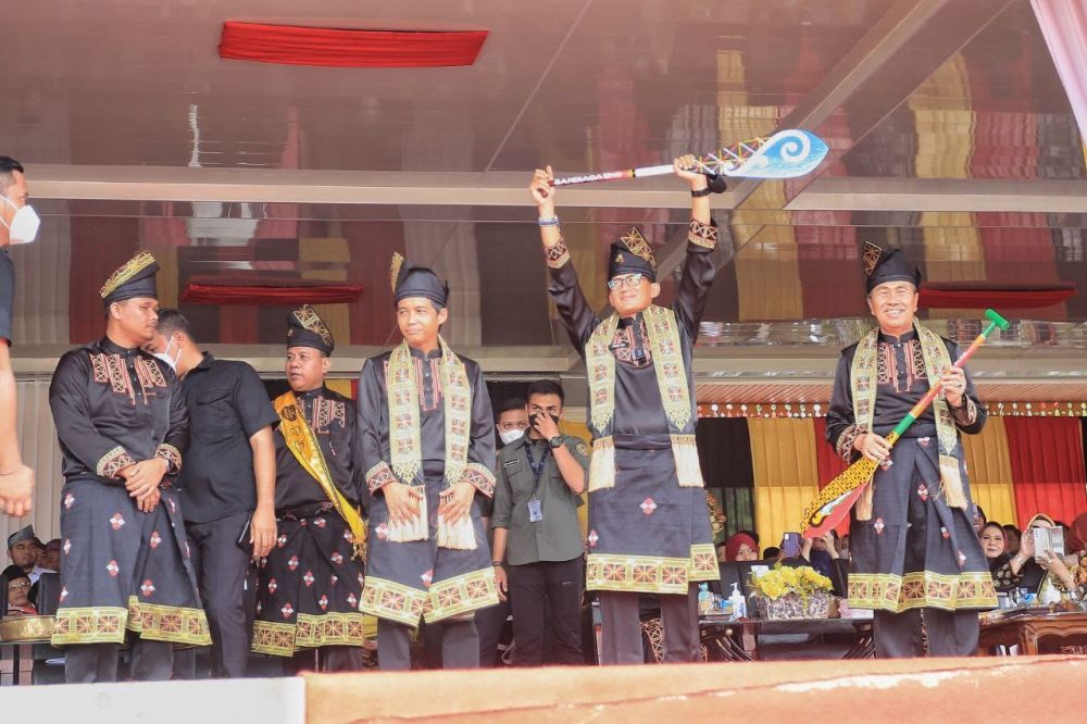"Bismillahirrahmanirrahim, maka festival pacu jalur event nasional tahun 2022 secara resmi dibuka. Insyaallah event ini berjalan lancar dan sukses," kata Sandiaga saat meresmikan festival pacu jalur yang didampingi langsung oleh Wakil Menteri ATR/BPN RI, Raja Juli Antoni yang ditandai dengan pemukulan gong.