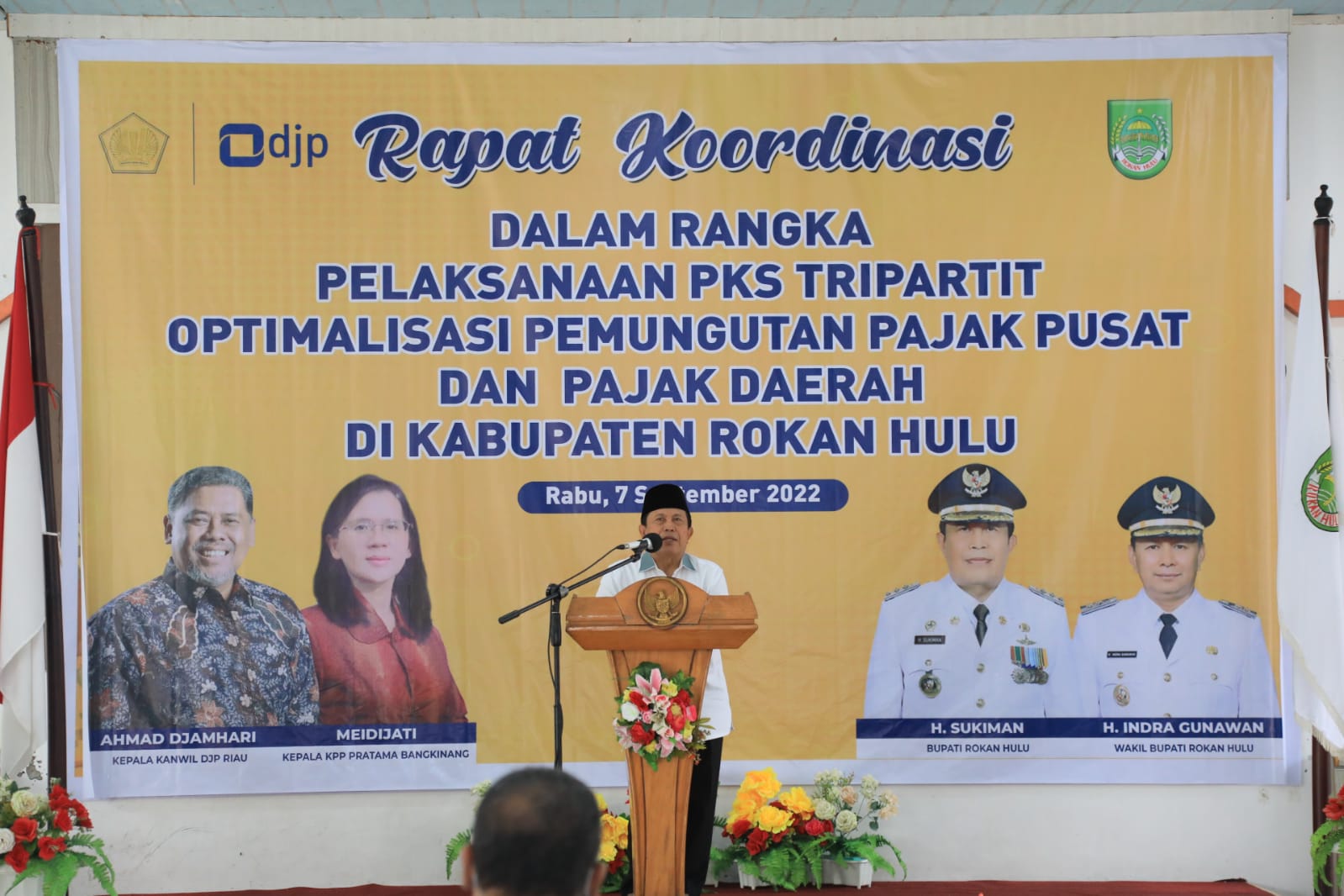 UTUSANRIAU.CO, ROKAN HULU - Untuk mengoptimalisasi pemungutan pajak pusat dan pajak daerah di wilayah Kabupaten Rokan Hulu (Rohul) tahun 2022. Pemkab Rohul lakukan perjanjian Kerja Sama (PKS) Tripartit bersama Kanwil DJP Provinsi Riau, di Pendopo Rumdis Bupati, Rabu (7/9/2022).