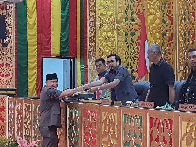 Ket Foto : Pimpinan DPRD Pekanbaru, Ginda Burnama ST didampingi Sekdako Pekanbaru, H Muhammad Jamil menerima pandangan fraksi dari Juru Fraksi PAN, Doni Saputra dalam Rapat Paripurna, Kamis (29/9/2022).