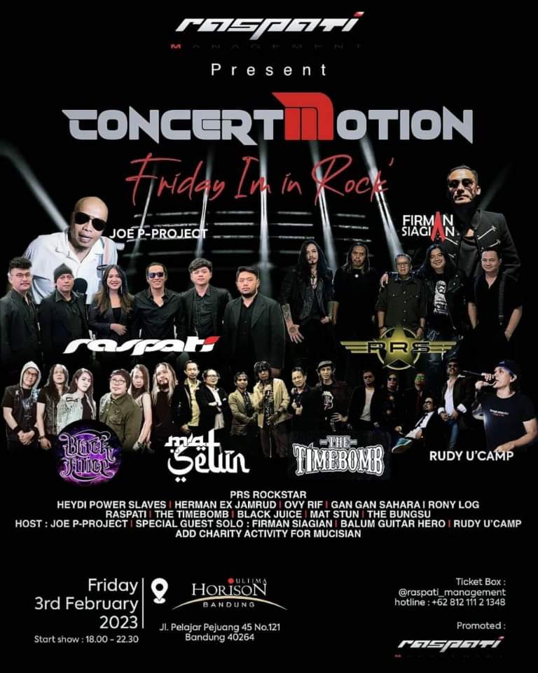 UTUSANRIAU.CO, BANDUNG - Eksistensi rock kembali bergairah pada awal tahun 2023. Aliran musik cadas tersebut lagi viral-viralnya saat ini, terutama pada kalangan milenial. Raspati Management menyambut situasi tersebut dengan menggelar Concertmotion bertajuk "Friday Im in Rock" pada Jumat, 3 Februari 2023 pukul 18.00 - 22.30 WIB di Horison Ultima Hotel, Bandung.