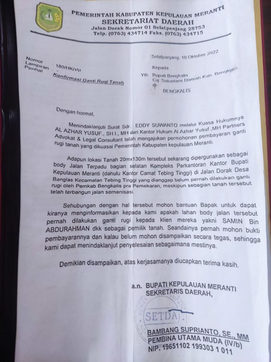 "Sebenarnya kita sudah menyurati Pemkab Bengkalis tertanggal 10 Oktober 2022, minta jawaban apakah tanah itu sudah diganti rugi atau belum," sebutnya.