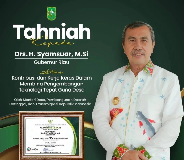 UTUSANRIAU.CO, PEKANBARU - Gubernur Riau (Gubri) Syamsuar dianugerahi penghargaan atas kontribusi dan kerja keras dalam membina pengembangan teknologi tepat guna desa.