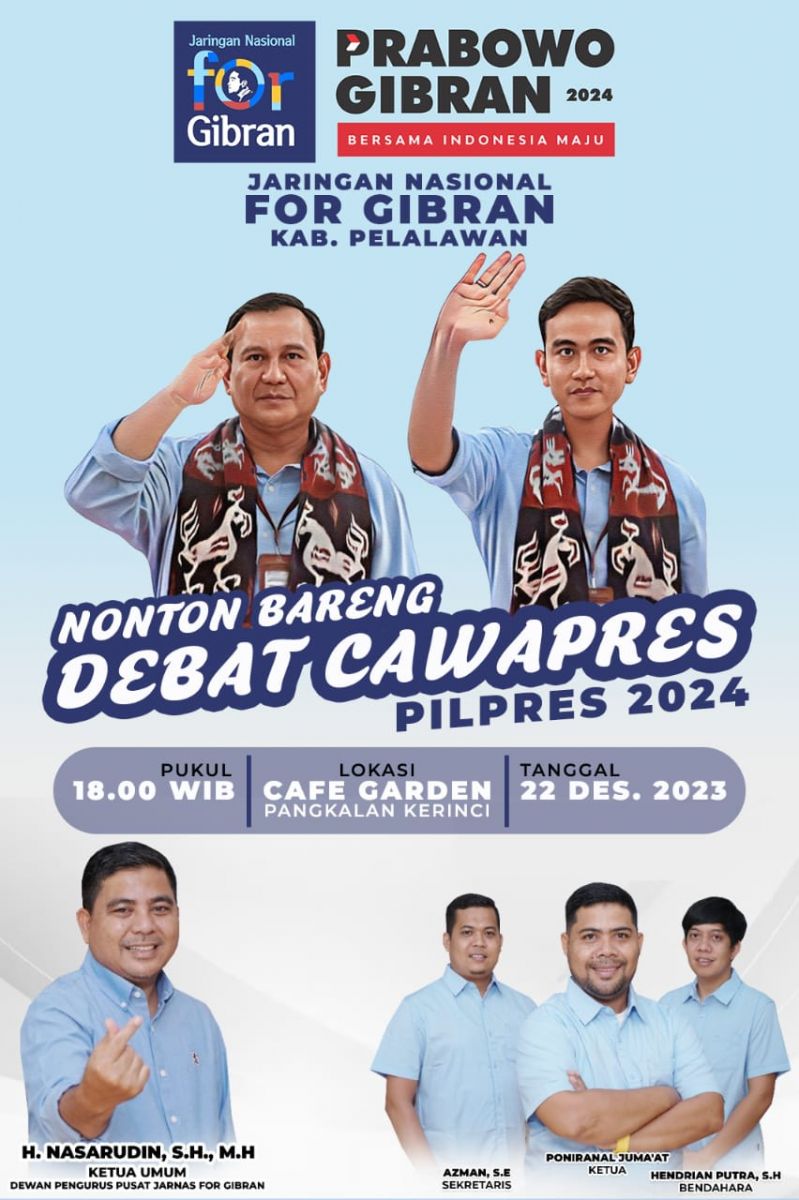 Ketua JasNas For Gibran Pelalawan yang mempersiapkan acara nonton bareng bernama Poniran menyampaikan bahwa anak muda berpotensi untuk menjadi pemimpin, Debat Capres sudah terlaksana beberapa waktu lalu, kita sudah melihat dan menilai dan malam ini debat Cawapres, selaku tim pemenangan Prabowo Gibran kami semakin optimis dan siap untuk bekerja untuk kemenangan pasangan no 02 di kabupaten Pelalawan.
