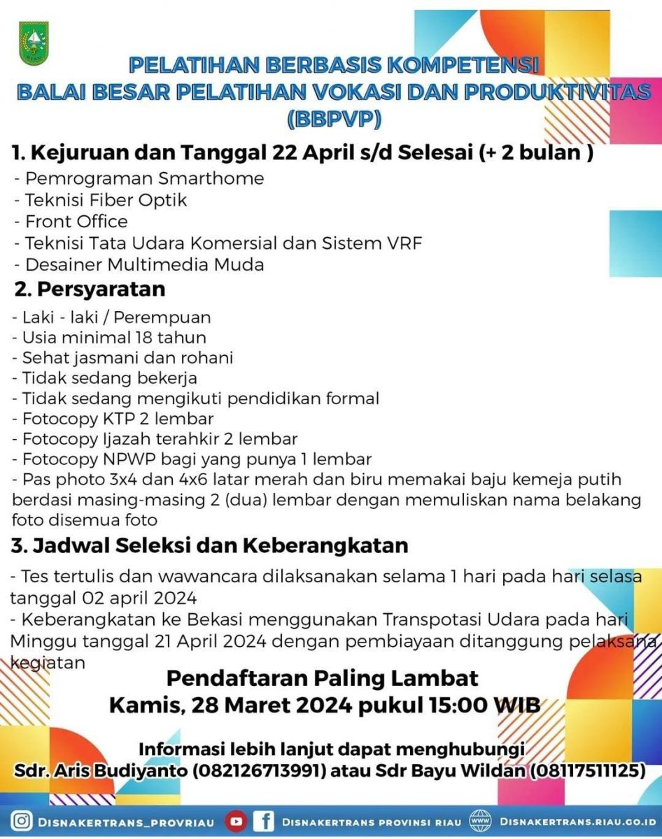 Kadisnakertrans Riau, Bobby Rachmat melalui Kasi Pelatihan Pemagangan dan Produktivitas Tenaga Kerja Provinsi Riau, Bayu Wildan menyampaikan, "Dari hasil seleksi nantinya para peserta untuk keberangkatan ke Bekasi menggunakan Transportasi udara pada hari Minggu Tanggal 21 April 2024 dengan pembiyaan ditanggung oleh pelaksana kegiatan. Dari 76 Peserta seleksi sebelumnya panitia hanya akan menerima 20 orang saja".