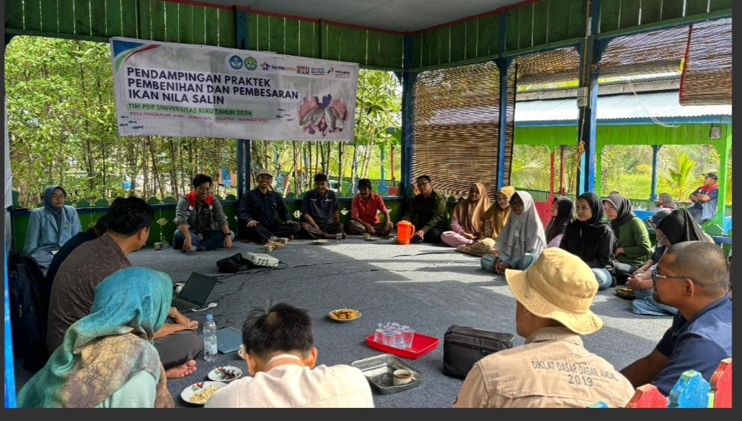 Ket Foto: Sebelum penebaran ikan di kolam, Tim PDP UNRI melakukan Pembekalan Pembenihan dan Pembesaran Ikan Nila yang baik.