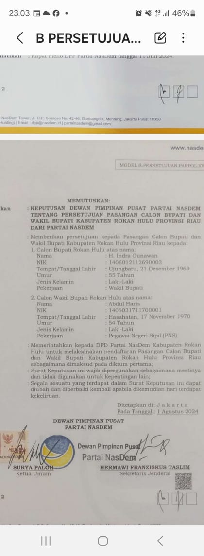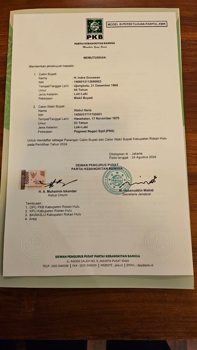 UTUSANRIAU. CO, ROKAN HULU - H.Indra Gunawan dan Abdul Haris Lubis akhirnya bisa berlayar dengan sampan PKB dan Nasdem di Pilkada tahun 2024,dan direncanakan akan mendaftar ke KPU Rohul Kamis (29/08/2024).