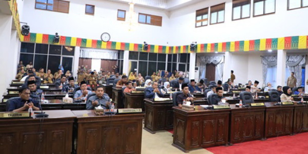 Suasana rapat paripurna di Gedung DPRD Rohul menjadi riuh dengan suara tepuk tangan termasuk Bupati Rohul H Sukiman, Forkopimda, Sekda Rohul Muhammad Zaki SSTP MSi, Anggota DPRD dan OPD Rohul yang hadir. (RIL/Humas DPRD Rohul)