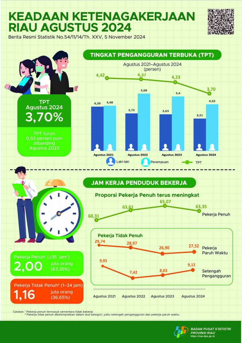 Badan Pusat Statistik (BPS) Provinsi Riau merilis Berita Resmi Statistik tentang Keadaan KetenagaKerjaan Riau Agustus 2024.